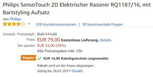 飞利浦2D智能三头剃须刀 根据面部曲线自动调节2D可动系统可以紧贴脸部剃须,可轻松调节顺应曲线,双重精确剃须,即使须茬再短,也可轻松剃除,全身可防水,洗澡也可以使用,带有胡须修型器和便携旅行袋, 充满可无线使用50分钟,充电三分钟可剃须一次,原价111欧,现折后仅79欧,激活页面下方优惠码,直接去结账还可立减14欧,最终到手价仅65欧,德国境内免邮到手!优惠码有效至2017年7月16日